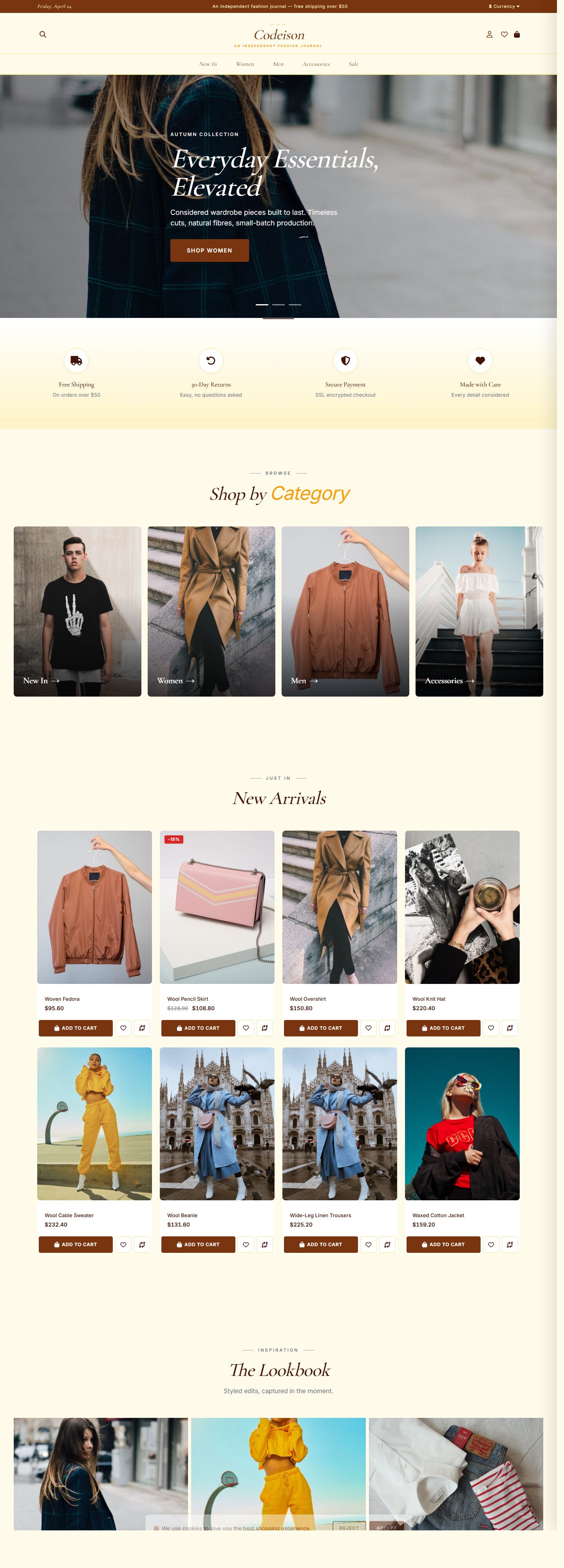 Where most fashion themes treat the storefront as a catalog, the Editorial layout treats it as a narrative. Magazine-style, story-driven, full-bleed imagery